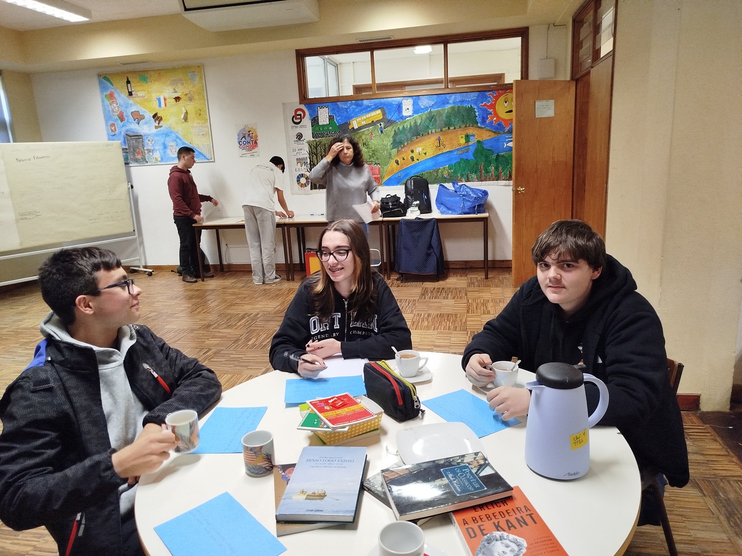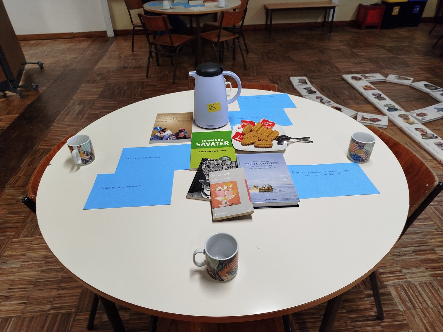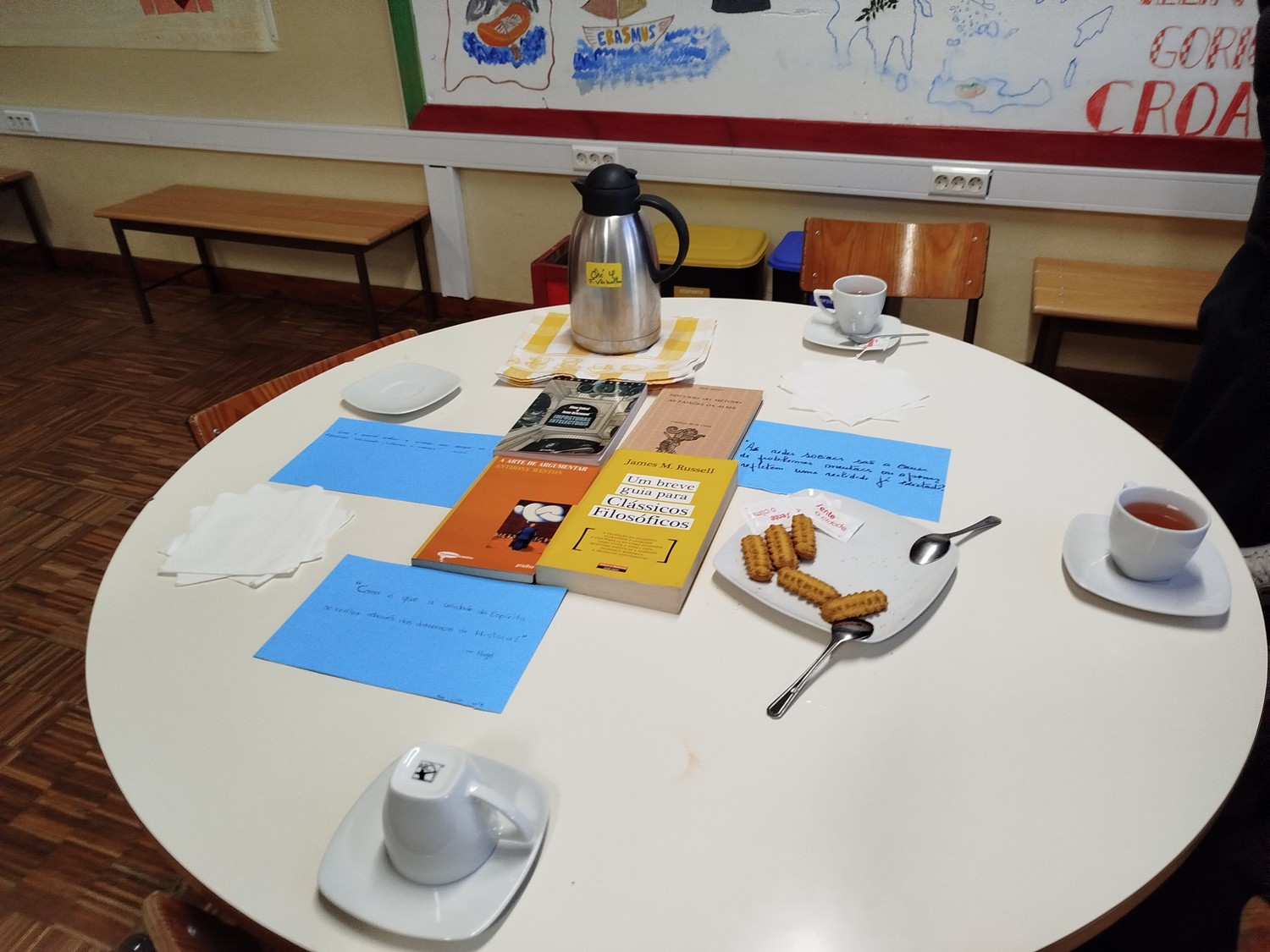 Na sala de convívio decorreu durante todo o dia, a dinâmica: Conversas Filosóficas, nos diferentes cantinhos, foi servido e degustado um chá filosófico, que foi partilhado numa versão intimista entre livros e temas em discussão sugeridos pelos alunos. Estes orientaram conversas e deixaram-se afetar pelo espirito critico tão necessário na formação dos jovens e na sociedade contemporânea.