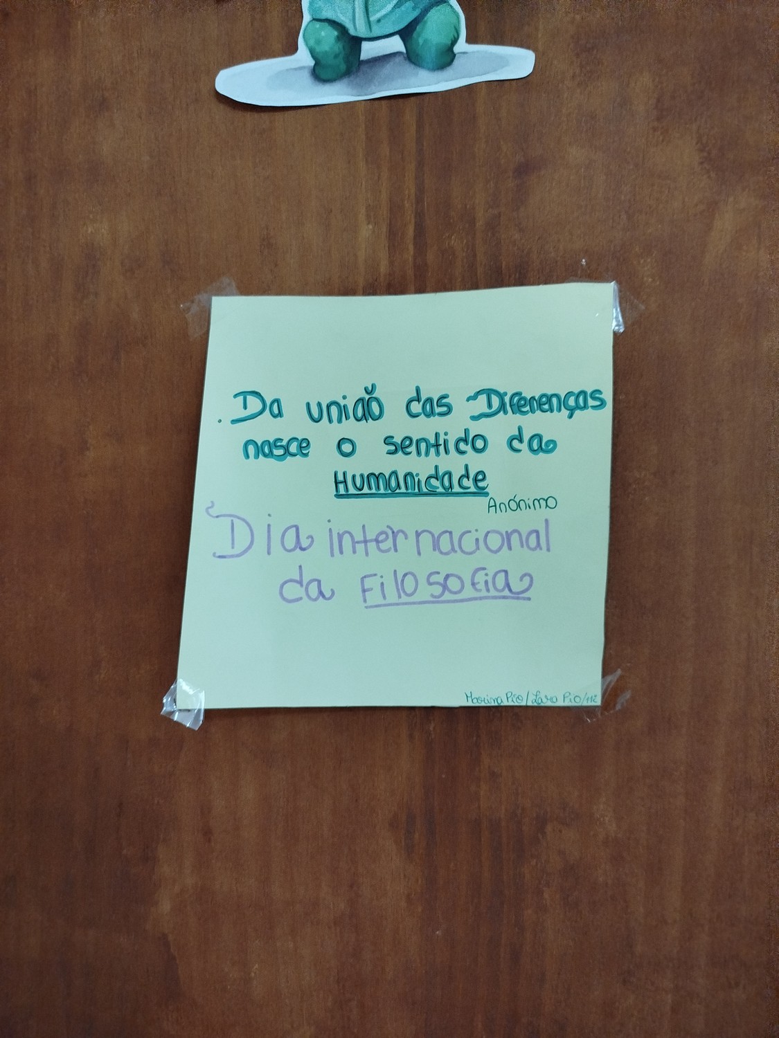 Assim, sob o lema: “A busca da Unidade para além das diferenças” tivemos a participação dos alunos na construção do mural: Mosaico da Unidade, produto de pesquisas orientadas, que permitiram a transcrição de citações filosóficas sobre a temática, bem como a sua projeção no Espelho Filosófico.
