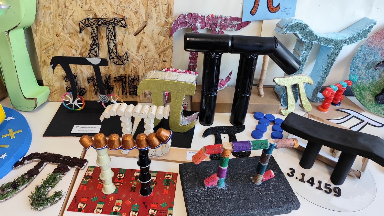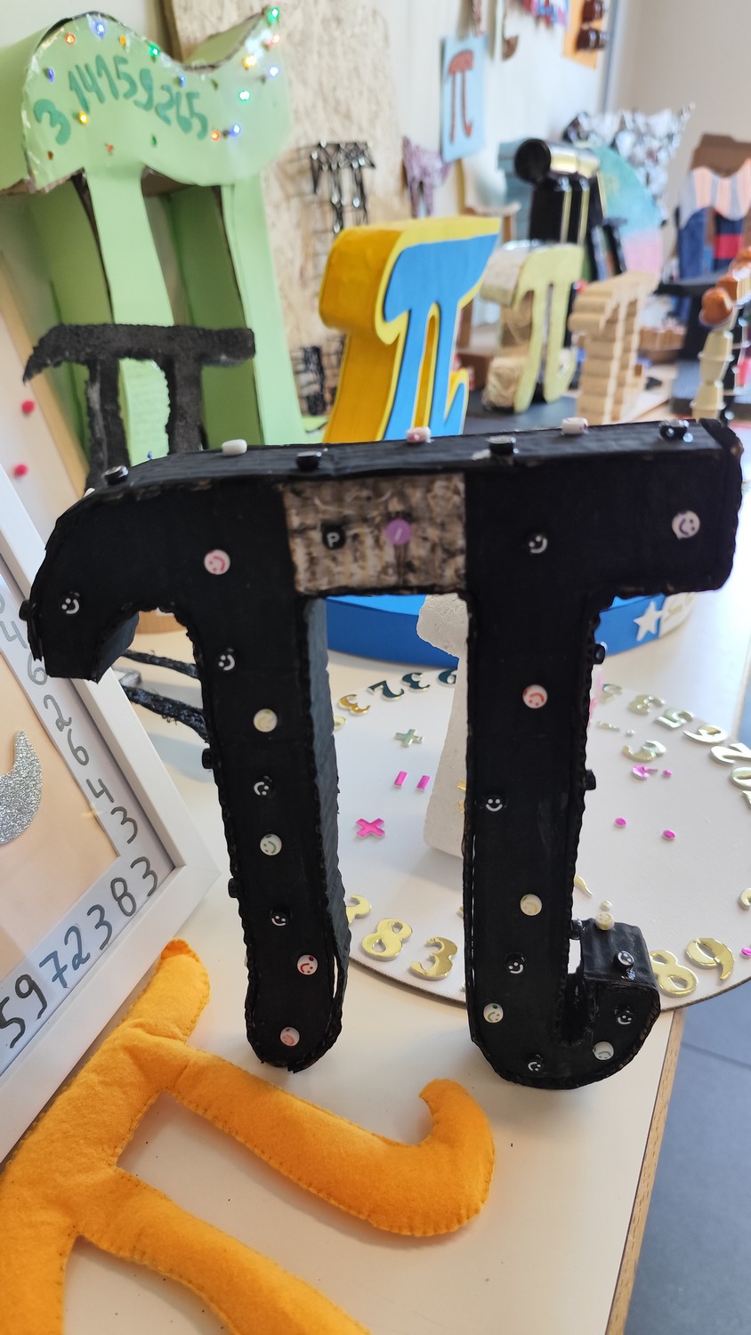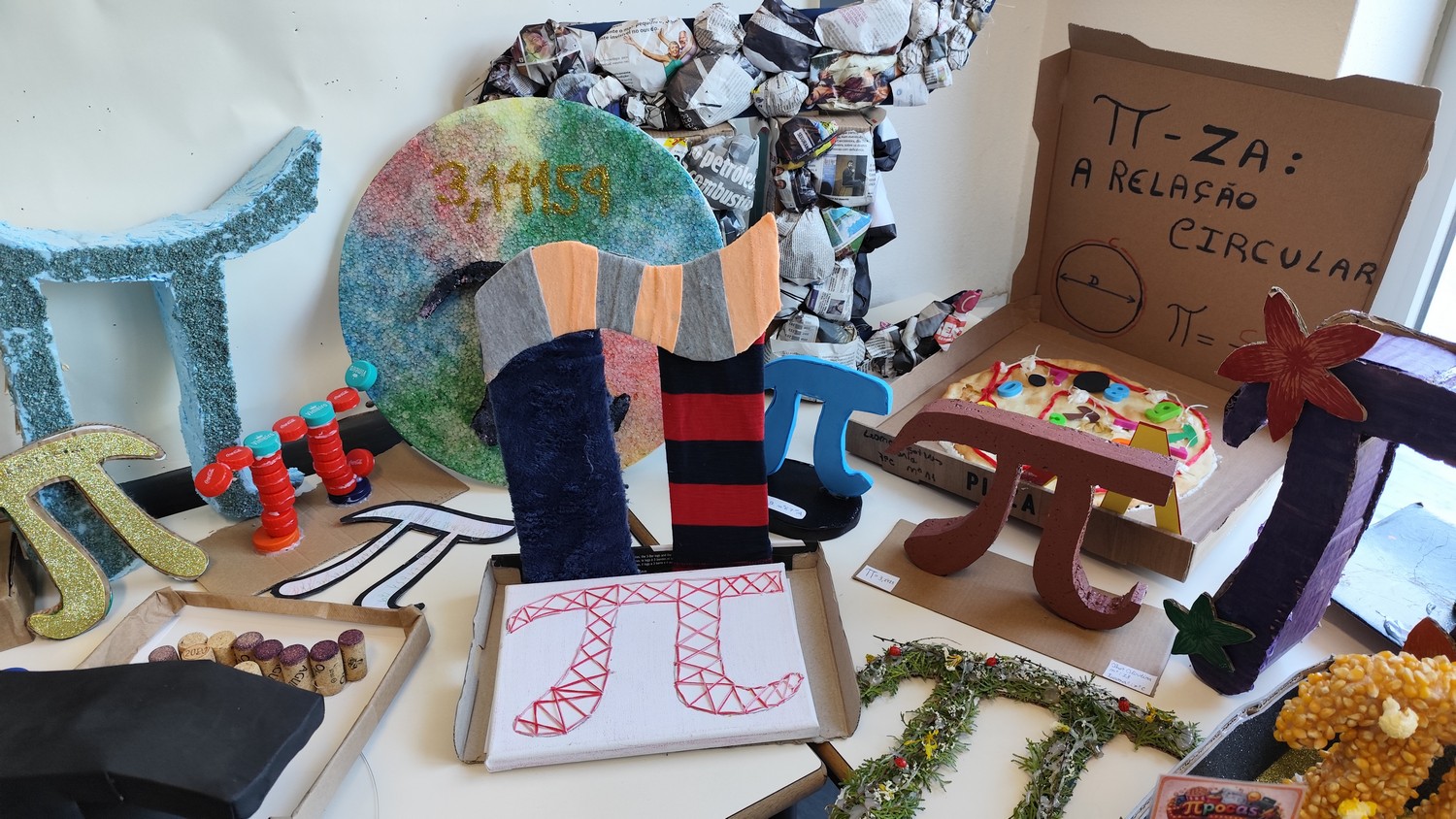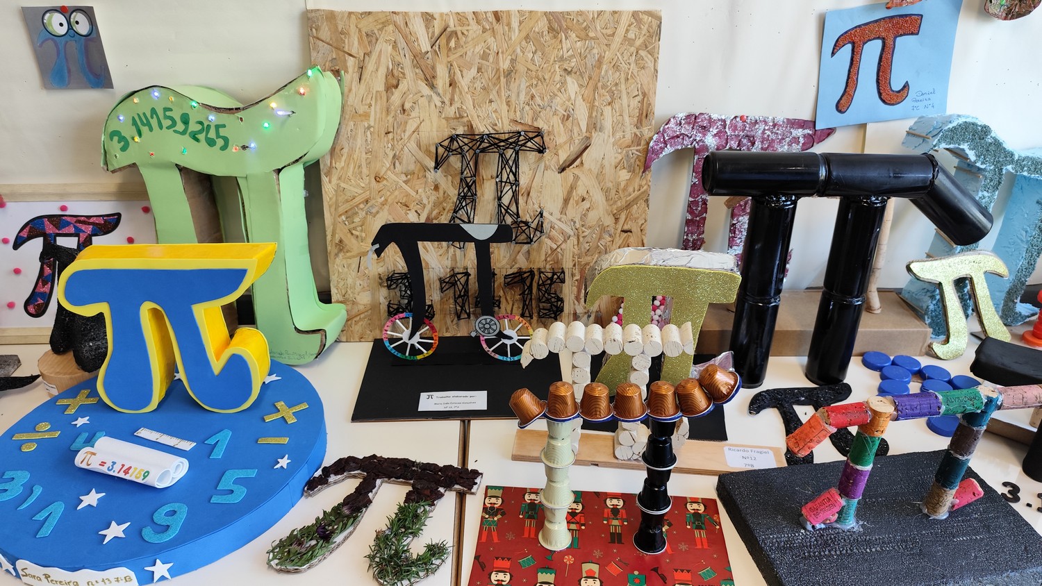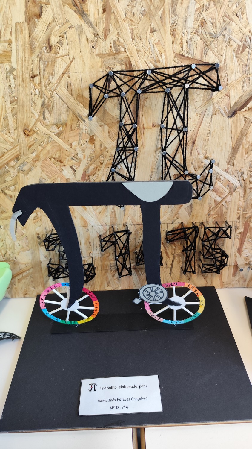 O desafio proposto consistiu na construção do símbolo π utilizando diferentes materiais, dando liberdade aos alunos para explorarem a sua criatividade. Assim, surgiram trabalhos muito variados, elaborados com materiais como papel, cartão, madeira, tampas, fios, elementos reciclados e outros objetos do quotidiano. Cada grupo procurou criar uma representação original do símbolo π, combinando matemática e expressão artística.