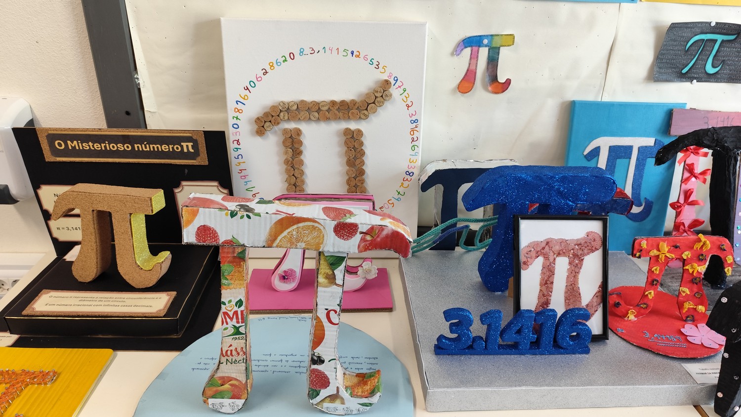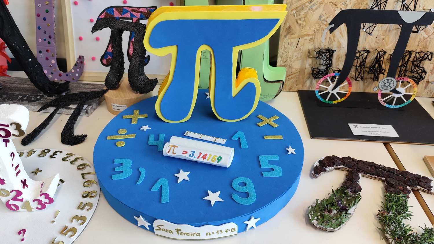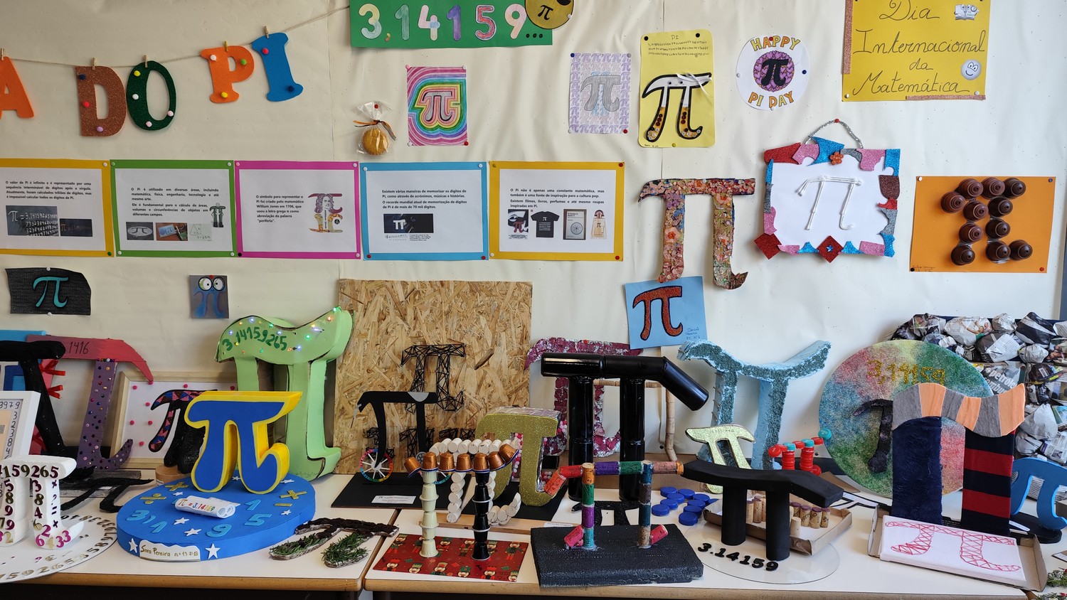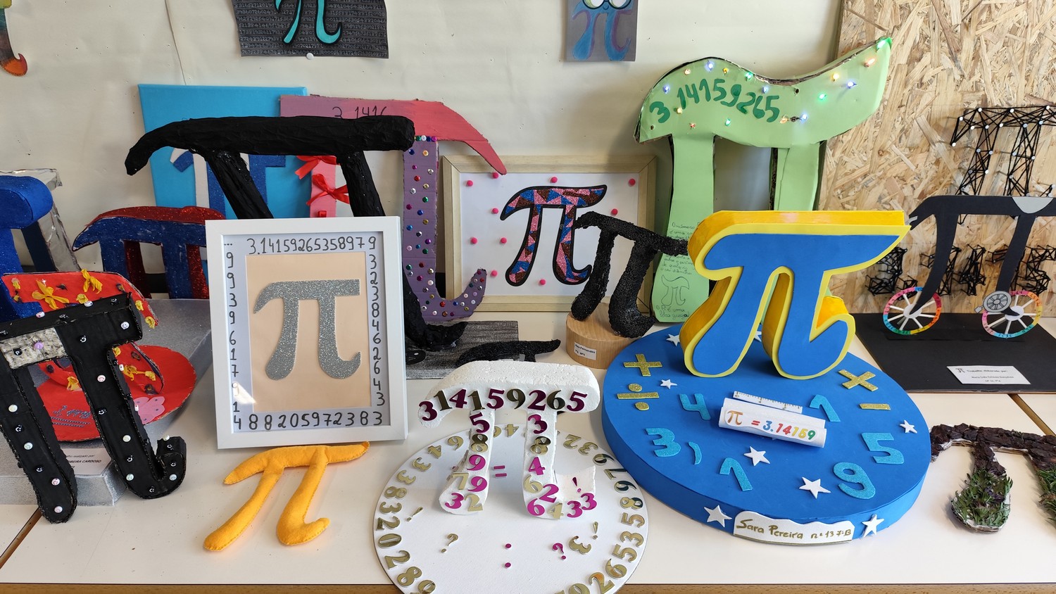 O desafio proposto consistiu na construção do símbolo π utilizando diferentes materiais, dando liberdade aos alunos para explorarem a sua criatividade. Assim, surgiram trabalhos muito variados, elaborados com materiais como papel, cartão, madeira, tampas, fios, elementos reciclados e outros objetos do quotidiano. Cada grupo procurou criar uma representação original do símbolo π, combinando matemática e expressão artística.