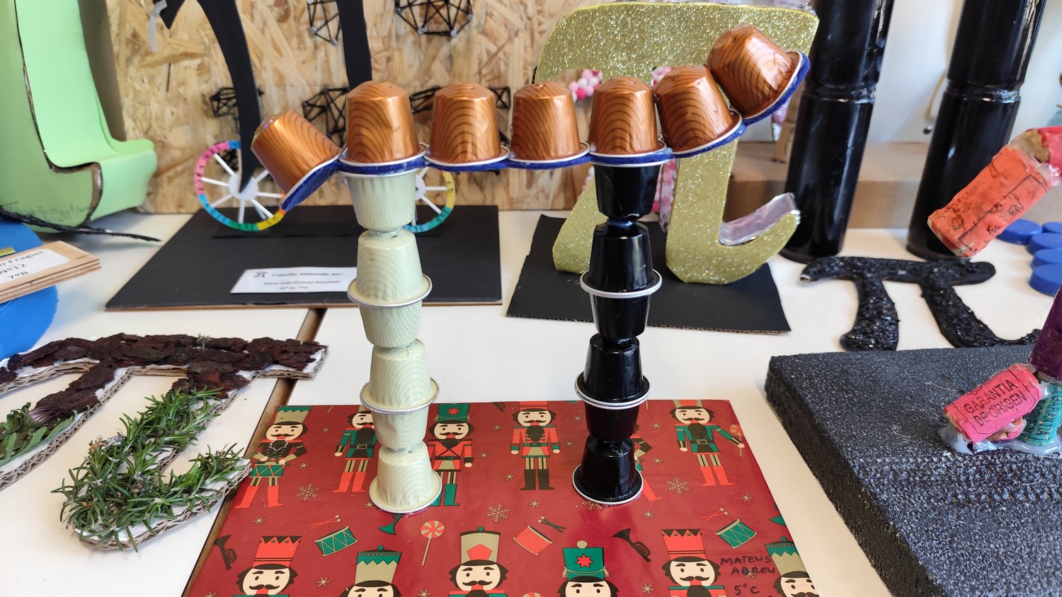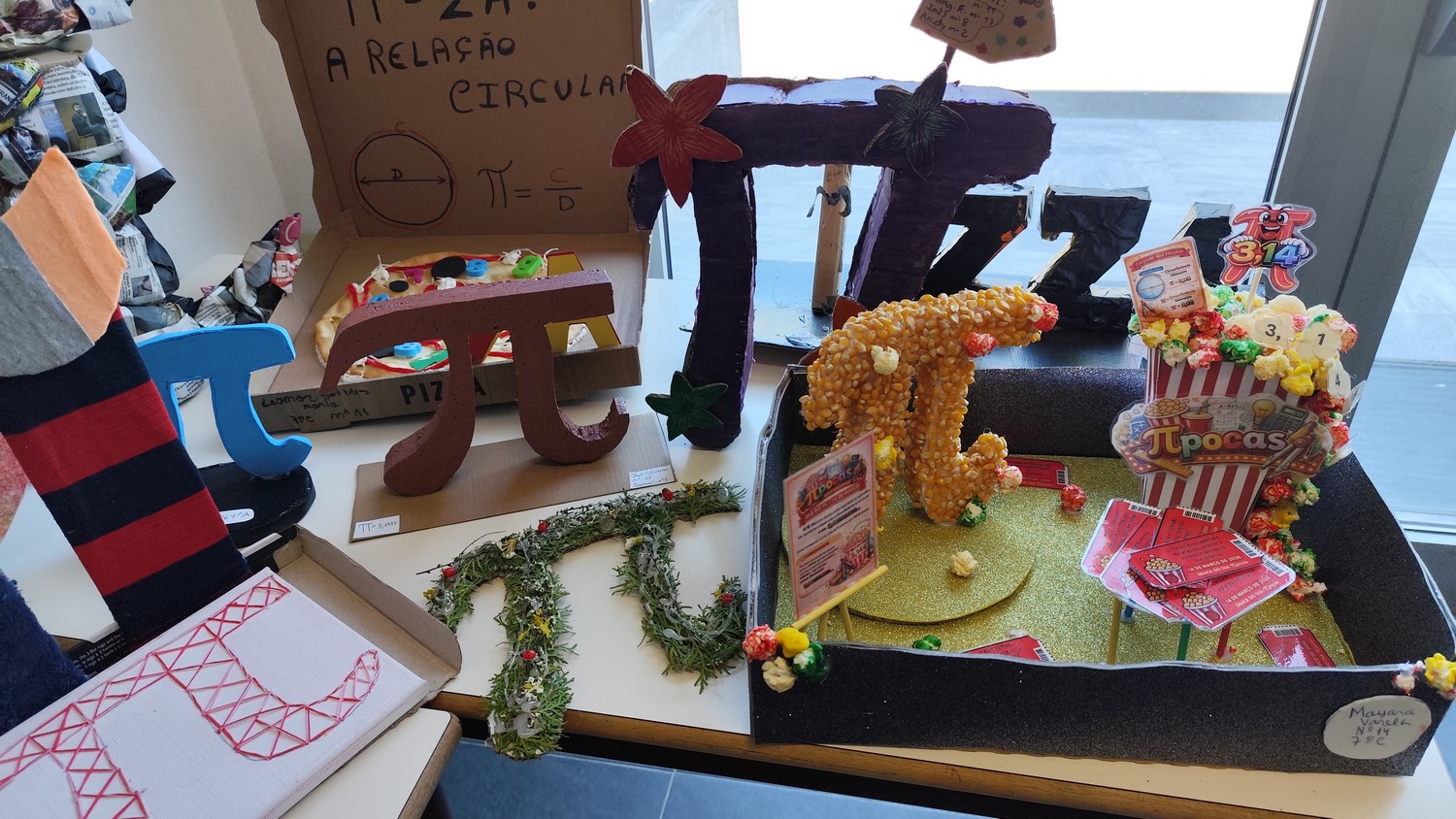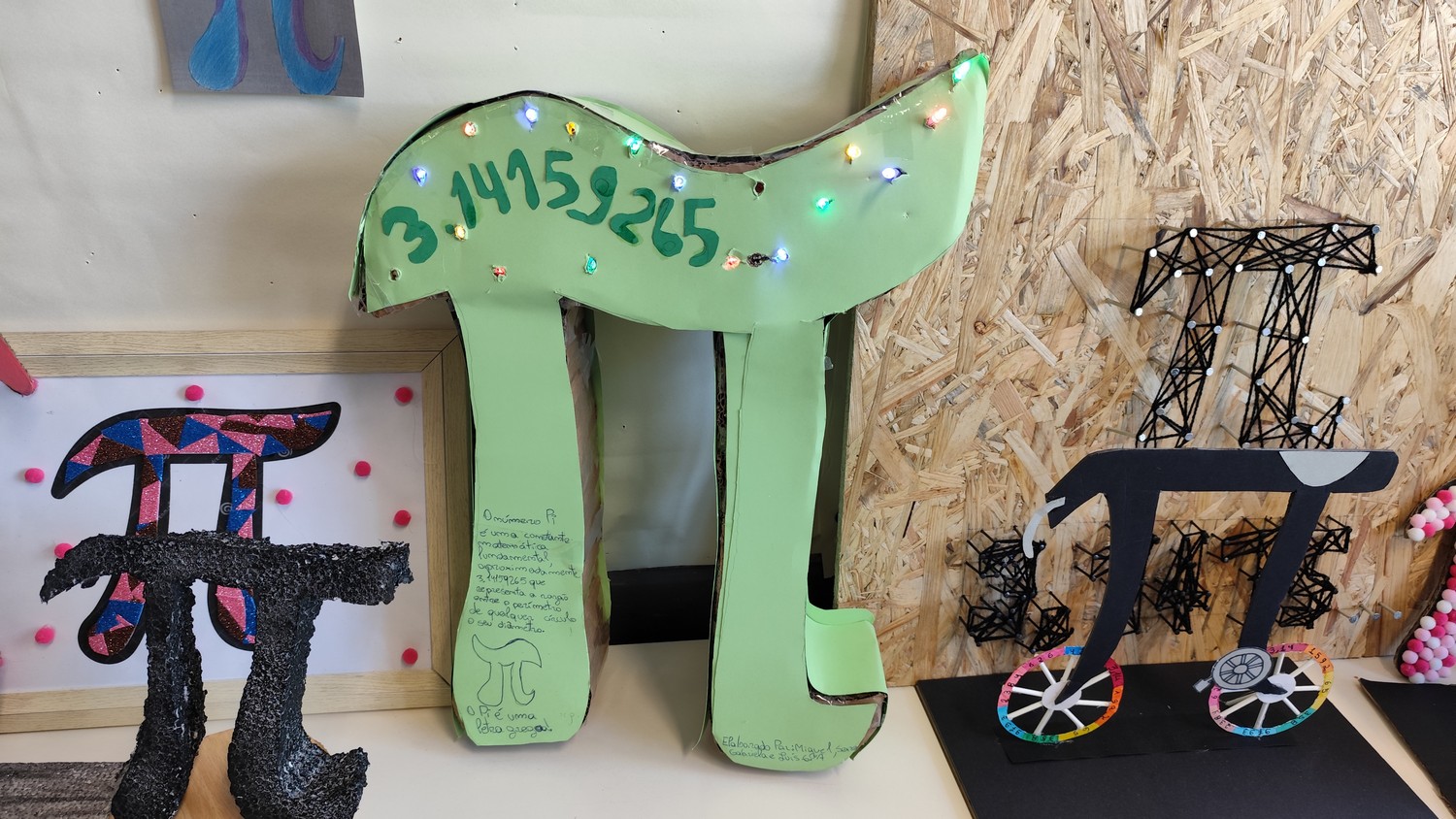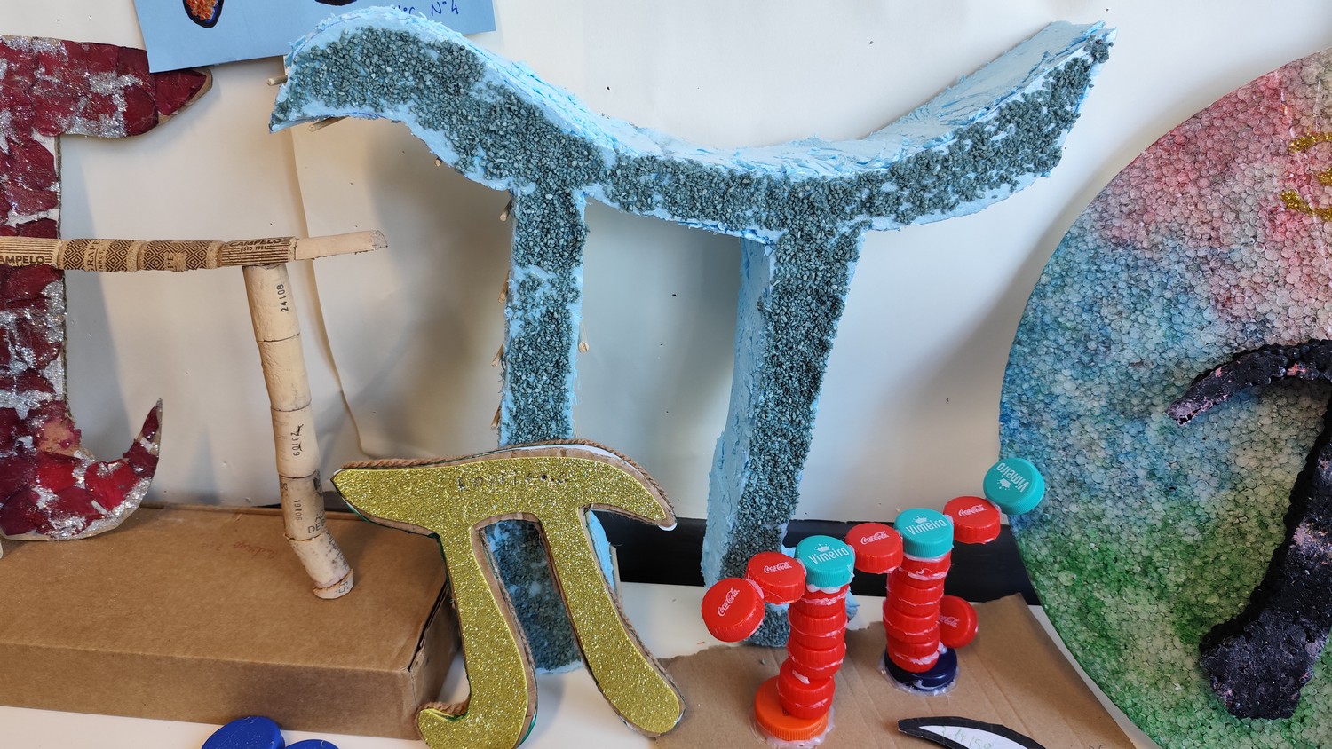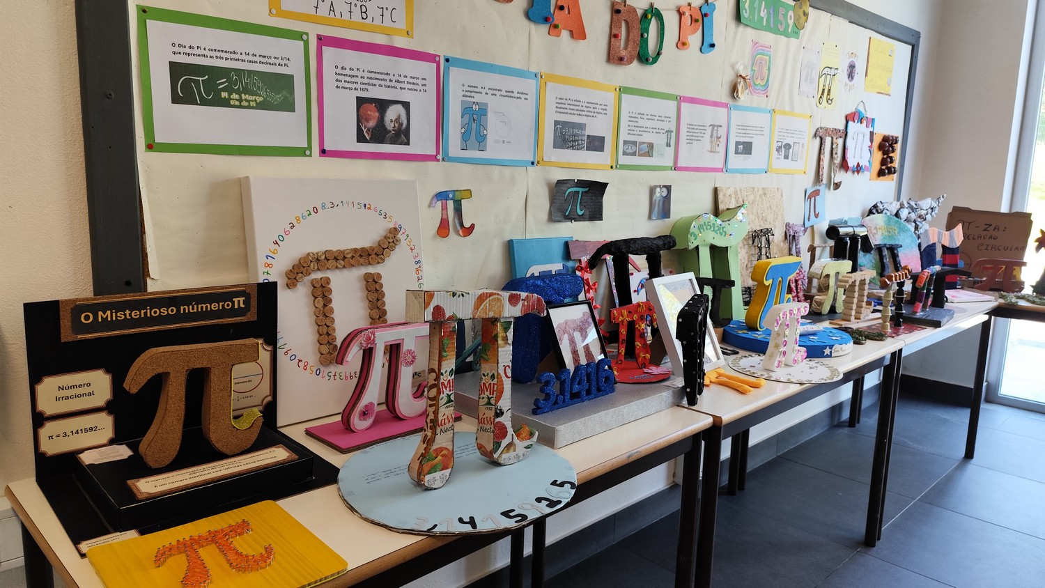 O desafio proposto consistiu na construção do símbolo π utilizando diferentes materiais, dando liberdade aos alunos para explorarem a sua criatividade. Assim, surgiram trabalhos muito variados, elaborados com materiais como papel, cartão, madeira, tampas, fios, elementos reciclados e outros objetos do quotidiano. Cada grupo procurou criar uma representação original do símbolo π, combinando matemática e expressão artística.