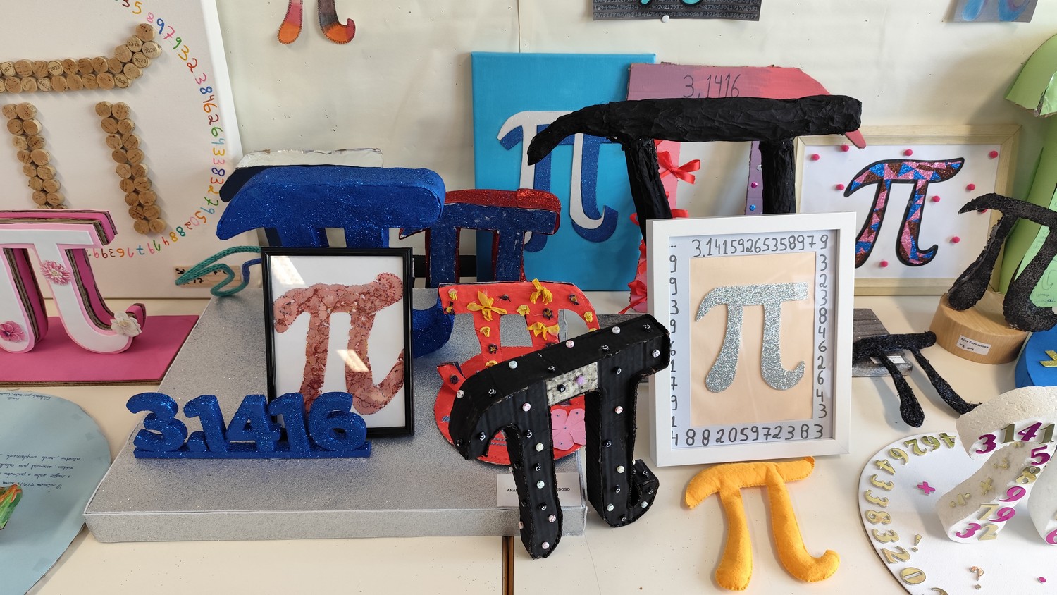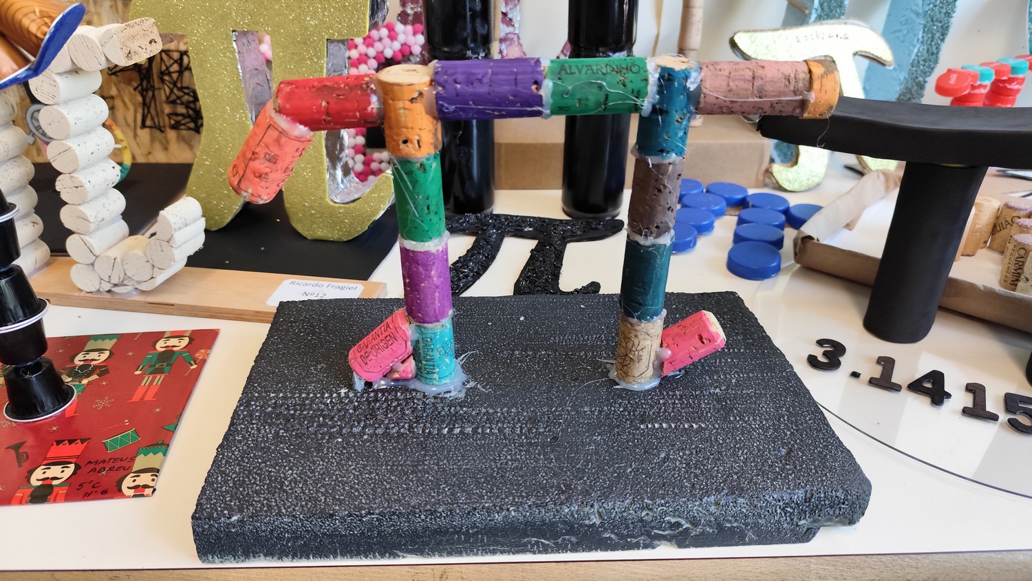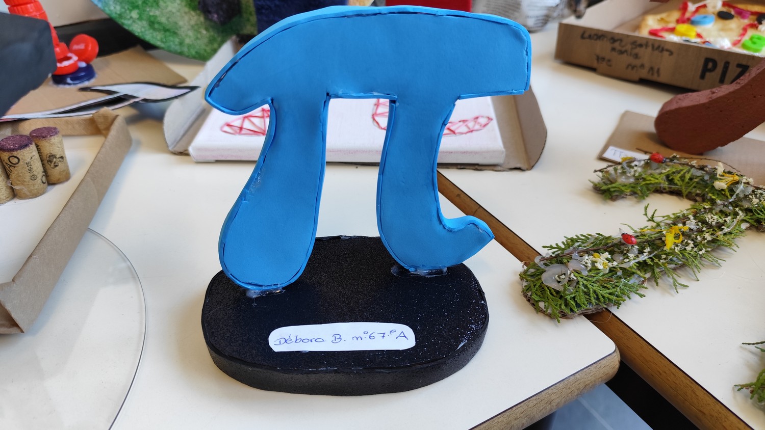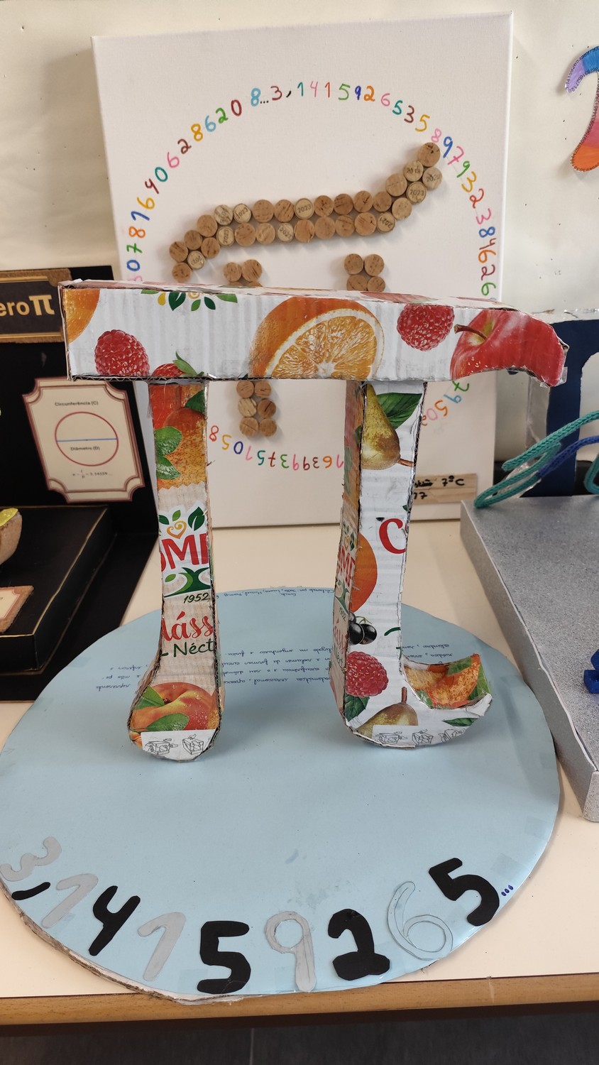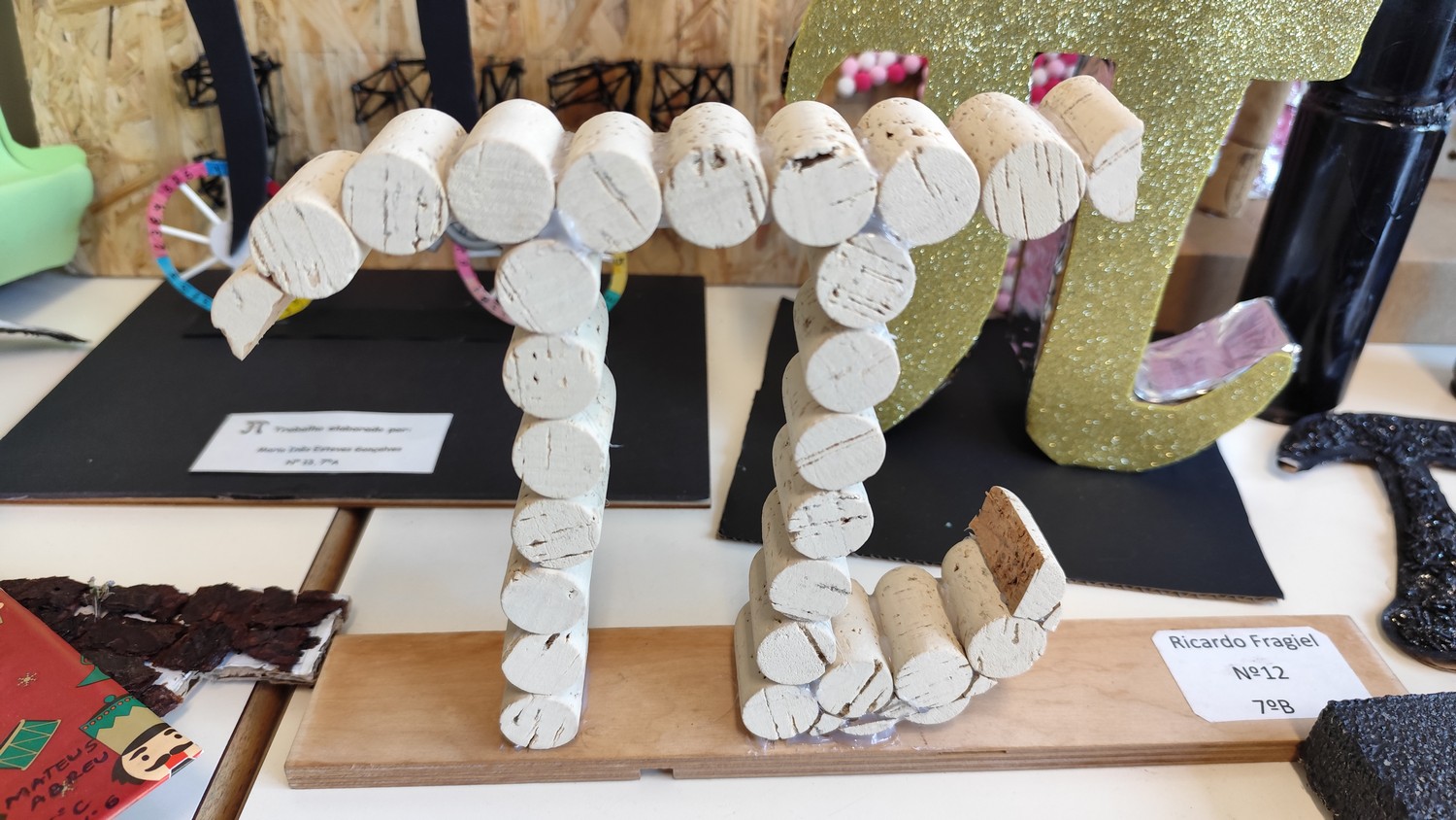 O desafio proposto consistiu na construção do símbolo π utilizando diferentes materiais, dando liberdade aos alunos para explorarem a sua criatividade. Assim, surgiram trabalhos muito variados, elaborados com materiais como papel, cartão, madeira, tampas, fios, elementos reciclados e outros objetos do quotidiano. Cada grupo procurou criar uma representação original do símbolo π, combinando matemática e expressão artística.