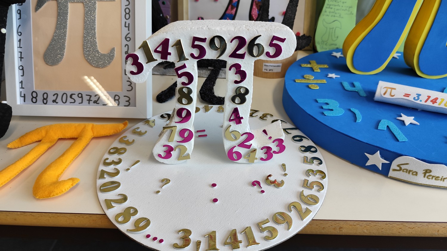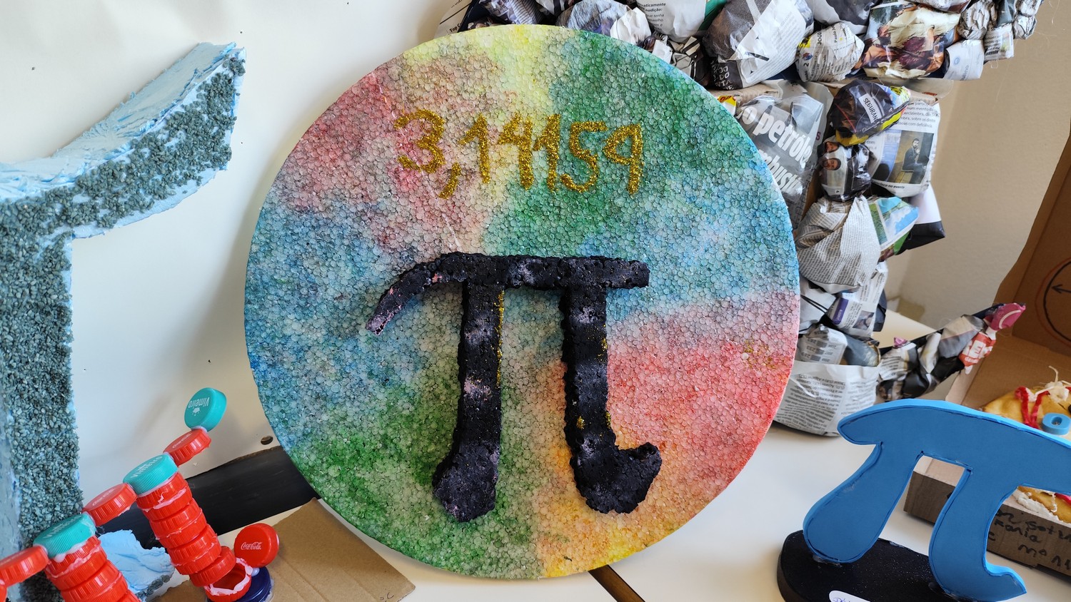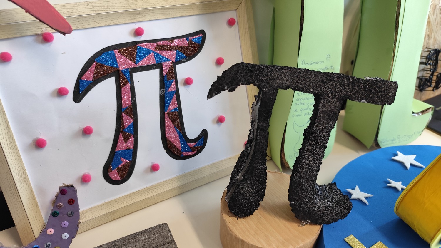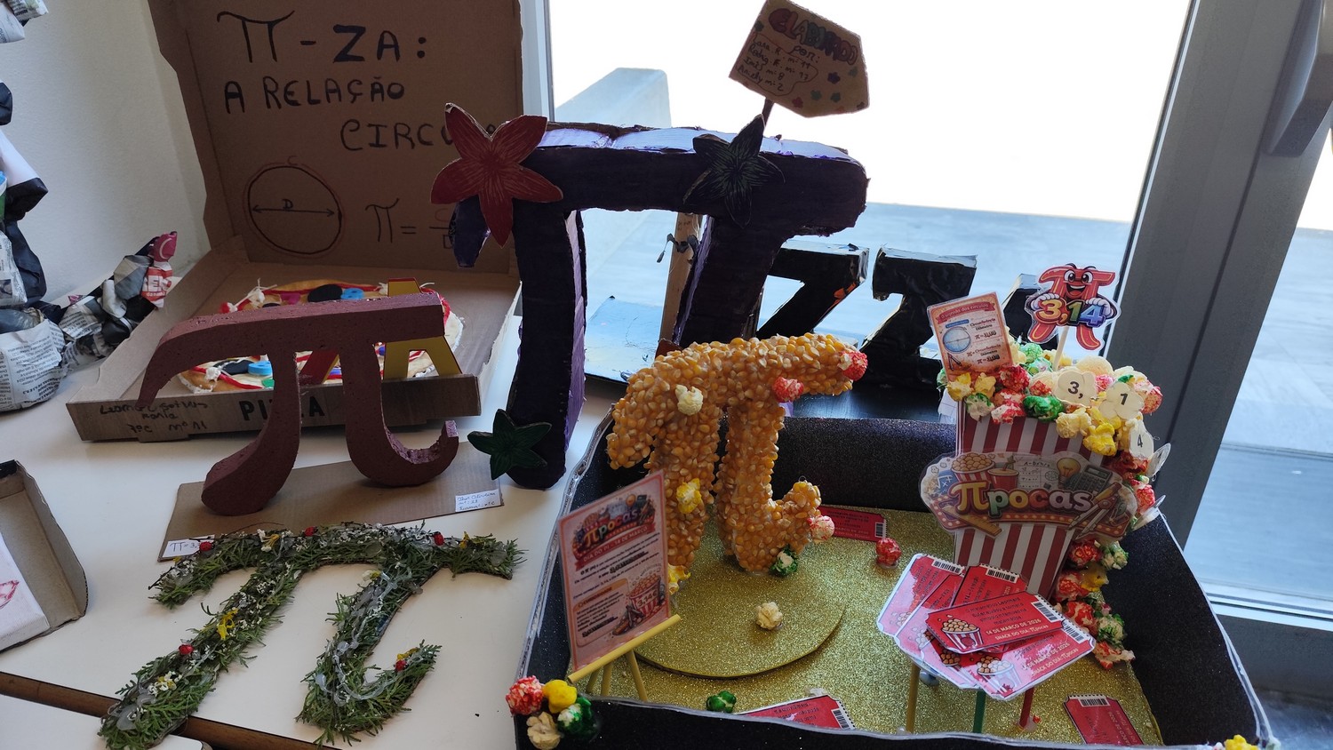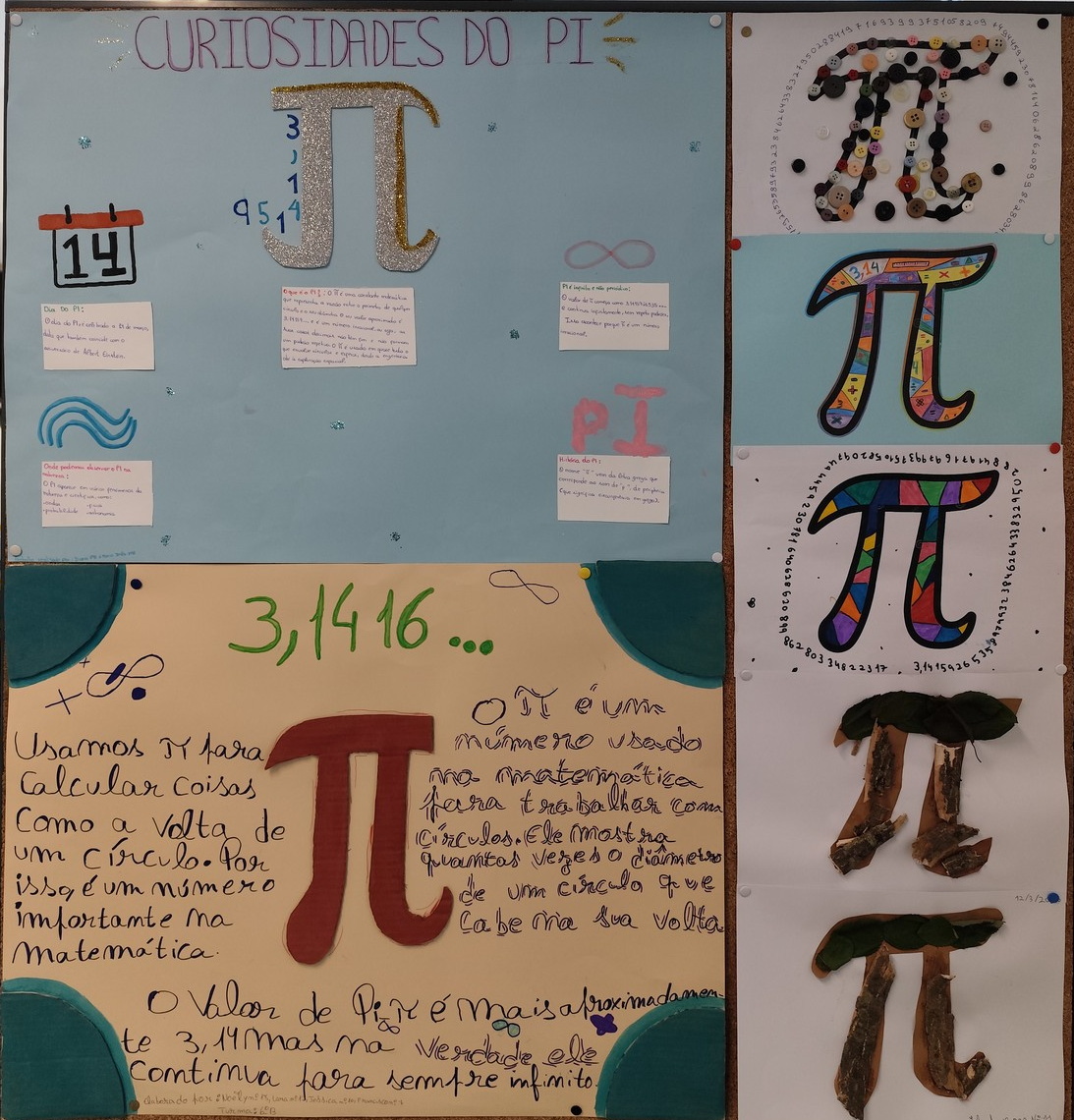 O desafio proposto consistiu na construção do símbolo π utilizando diferentes materiais, dando liberdade aos alunos para explorarem a sua criatividade. Assim, surgiram trabalhos muito variados, elaborados com materiais como papel, cartão, madeira, tampas, fios, elementos reciclados e outros objetos do quotidiano. Cada grupo procurou criar uma representação original do símbolo π, combinando matemática e expressão artística.