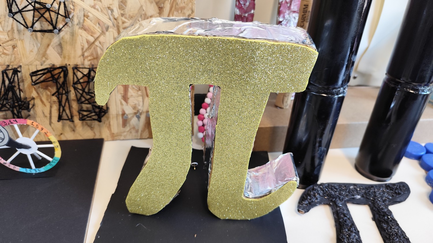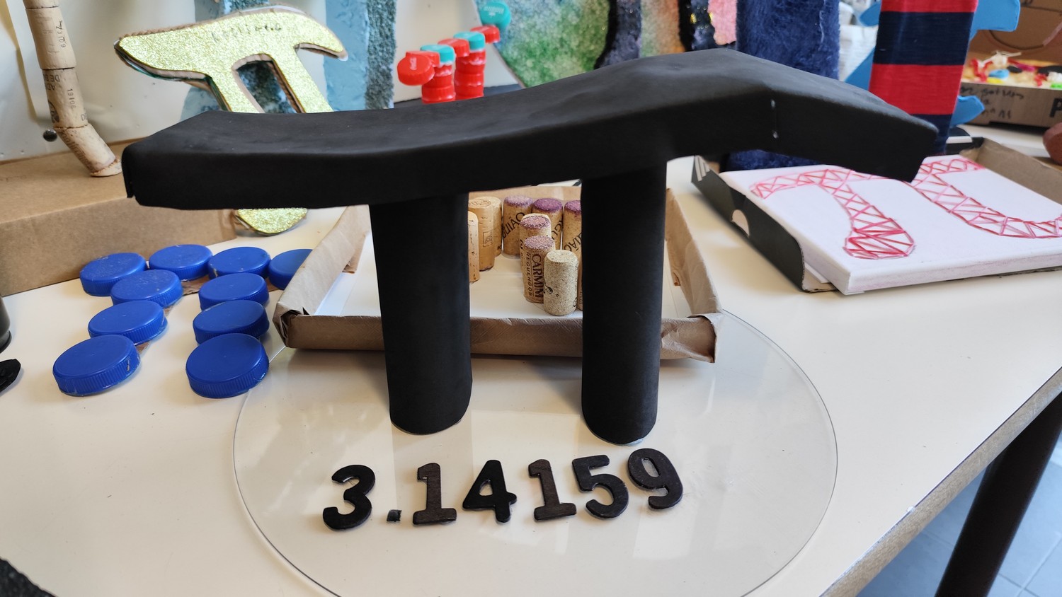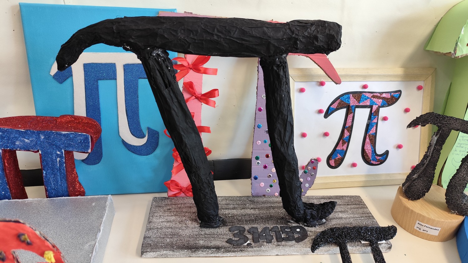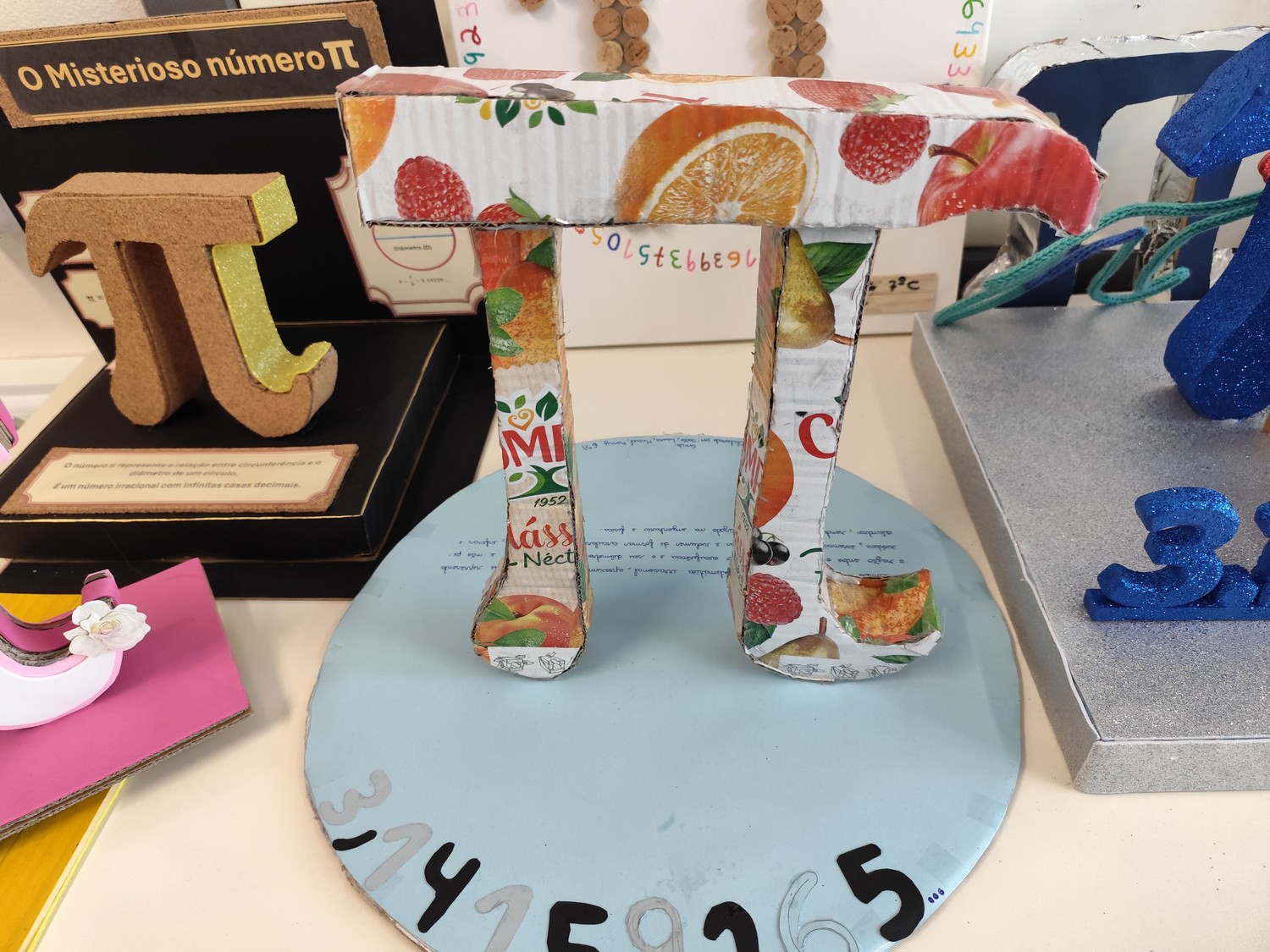 O desafio proposto consistiu na construção do símbolo π utilizando diferentes materiais, dando liberdade aos alunos para explorarem a sua criatividade. Assim, surgiram trabalhos muito variados, elaborados com materiais como papel, cartão, madeira, tampas, fios, elementos reciclados e outros objetos do quotidiano. Cada grupo procurou criar uma representação original do símbolo π, combinando matemática e expressão artística.