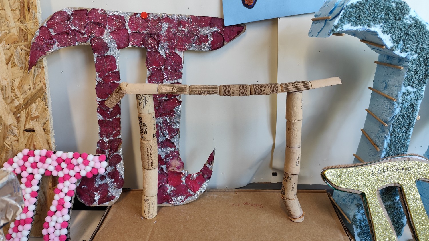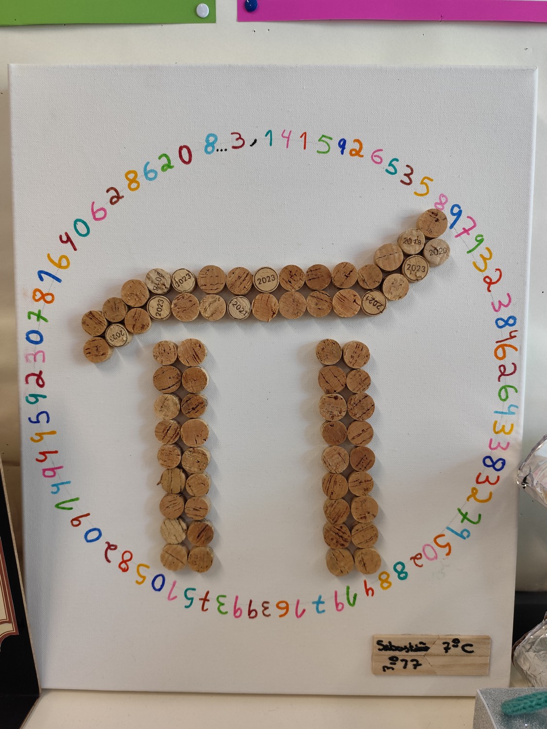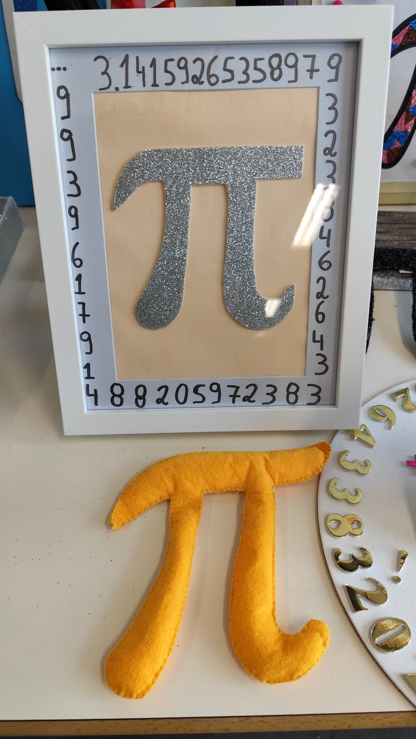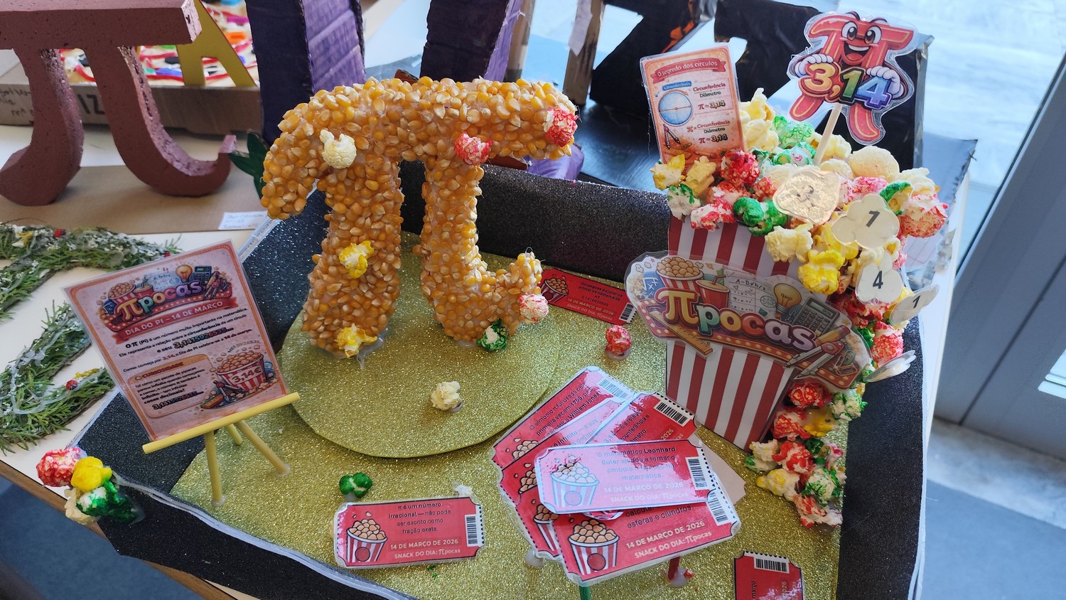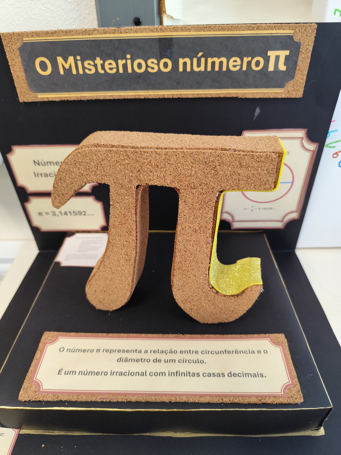 O desafio proposto consistiu na construção do símbolo π utilizando diferentes materiais, dando liberdade aos alunos para explorarem a sua criatividade. Assim, surgiram trabalhos muito variados, elaborados com materiais como papel, cartão, madeira, tampas, fios, elementos reciclados e outros objetos do quotidiano. Cada grupo procurou criar uma representação original do símbolo π, combinando matemática e expressão artística.