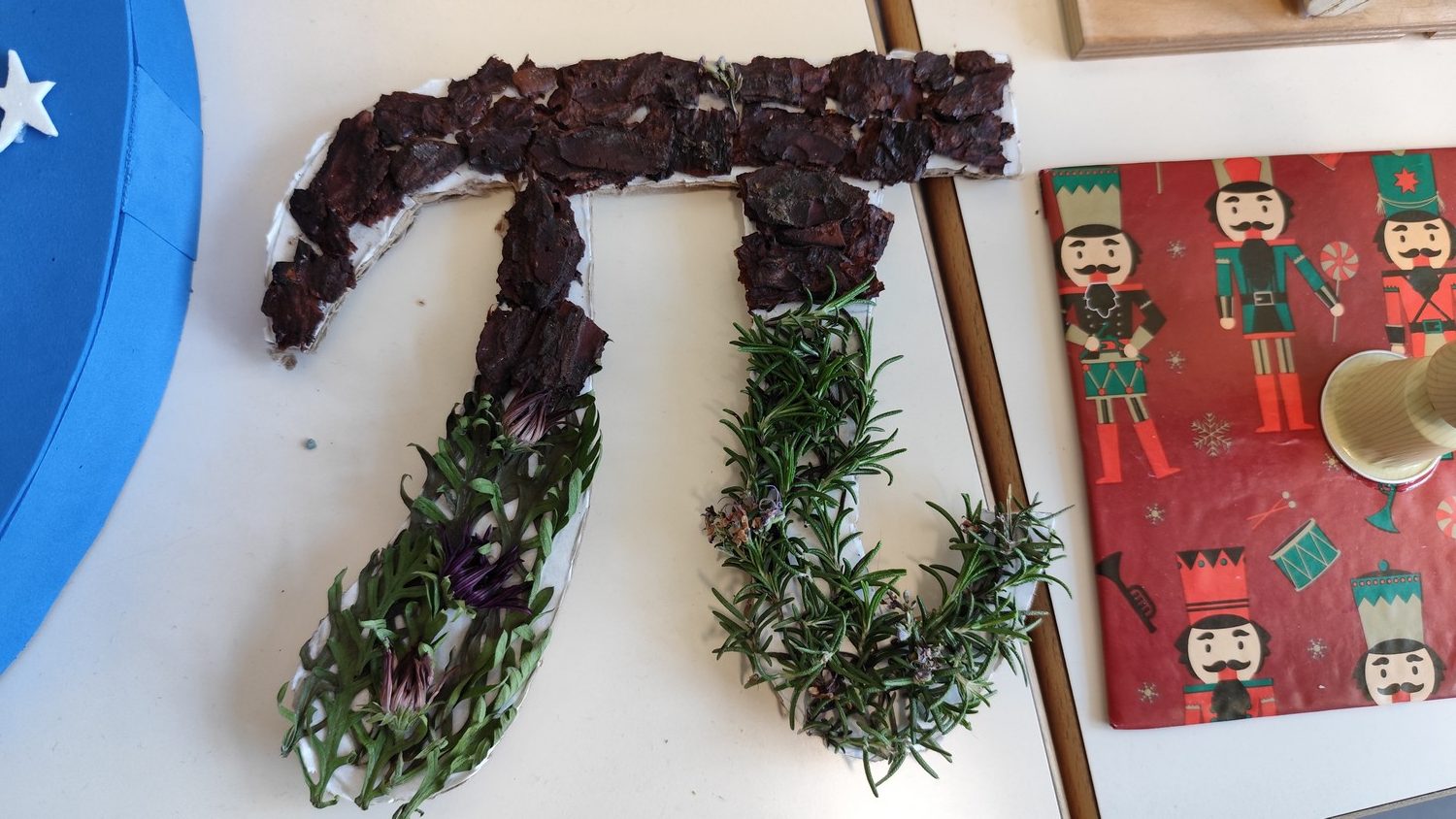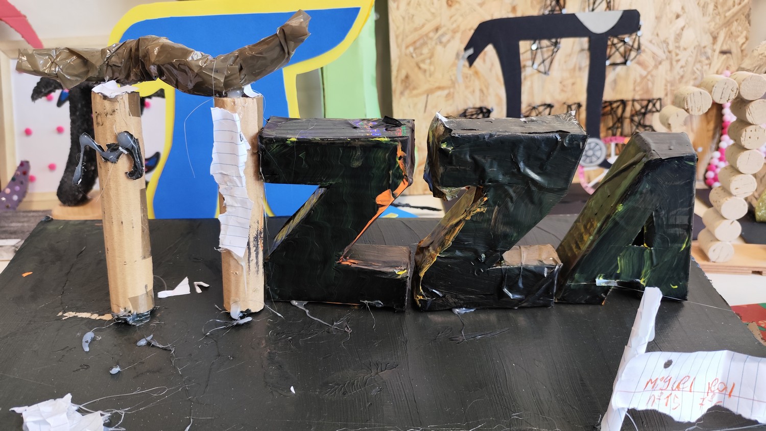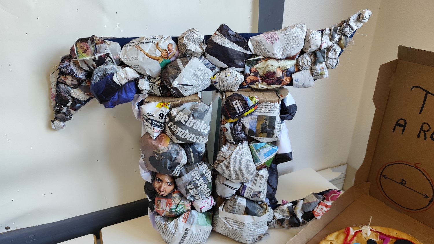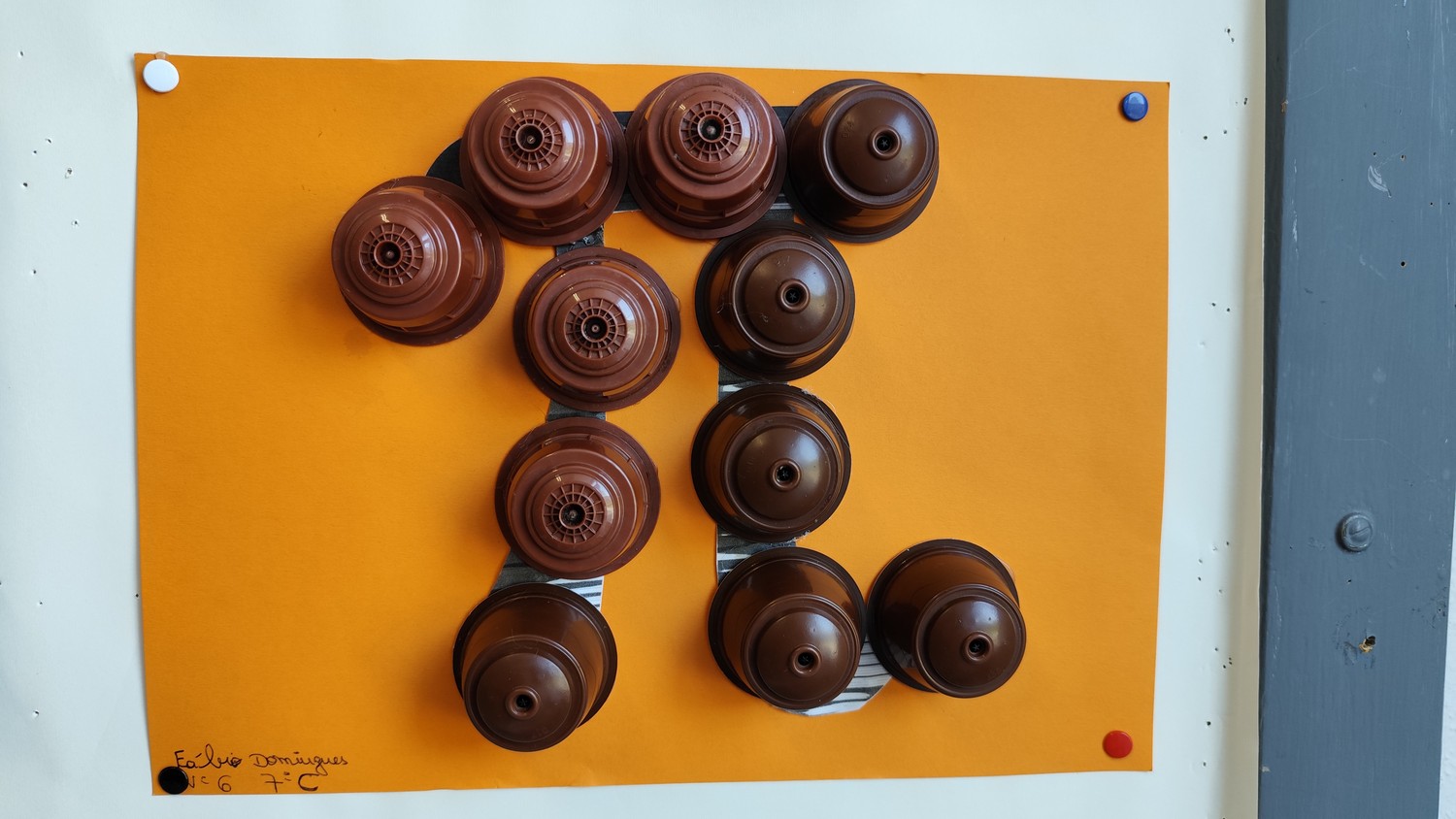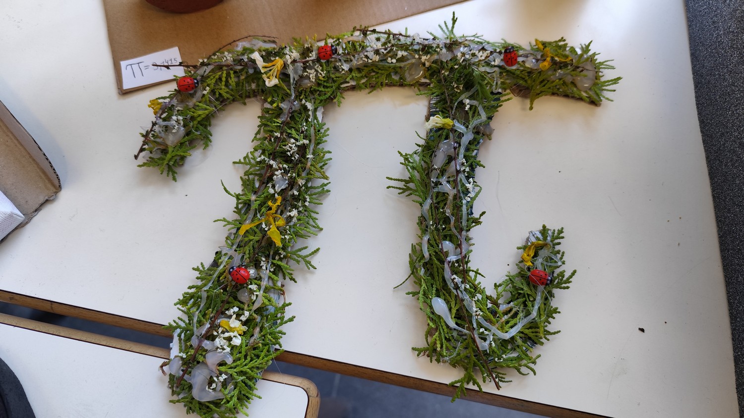 O desafio proposto consistiu na construção do símbolo π utilizando diferentes materiais, dando liberdade aos alunos para explorarem a sua criatividade. Assim, surgiram trabalhos muito variados, elaborados com materiais como papel, cartão, madeira, tampas, fios, elementos reciclados e outros objetos do quotidiano. Cada grupo procurou criar uma representação original do símbolo π, combinando matemática e expressão artística.